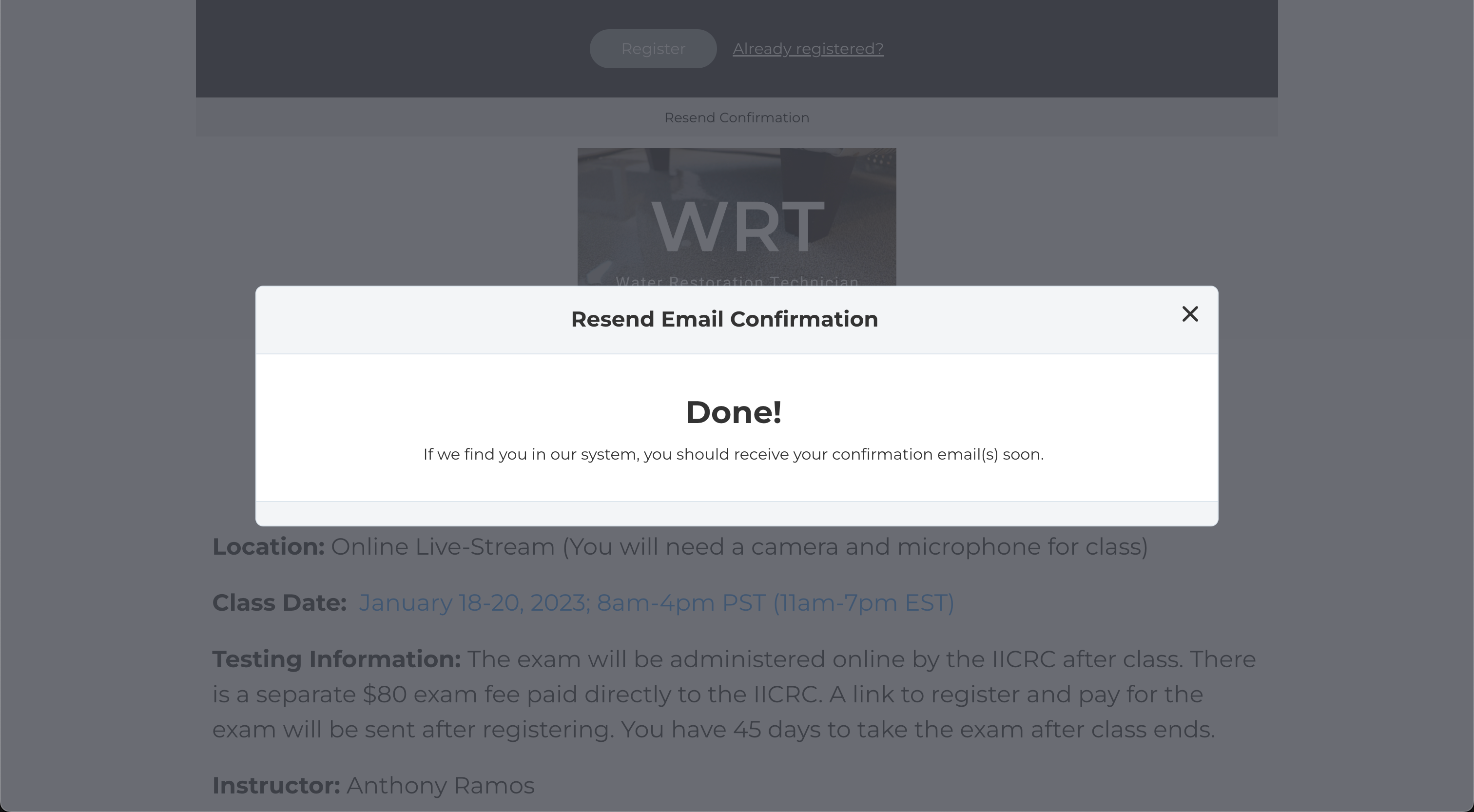 After registering for an IICRC course, you should receive a confirmation email with any course materials and the location or Zoom link to the class.